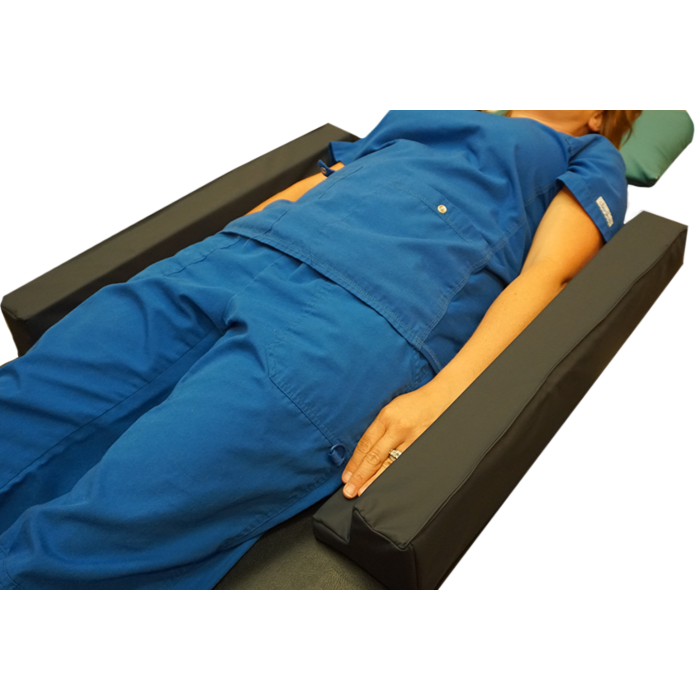 Arm rest L-shaped to help support a patient’s arms during MRI procedures. 3.5” wide x 3.5” tall x 24” long. The material covering is made from an advanced breathable polymer vinyl fabric which allows for easy cleaning and maintenance. Material increases a patients comfort when compared to standard plastic covers. Product is latex free. Two-piece set.