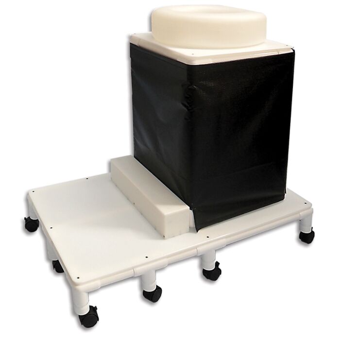 Seat-frame is secured onto a platform with rolling/locking casters. Base height of toilet seat with platform and 4.5” Raised Toilet Seat is 37" high. 4.5” Raised Toilet Seat with opening to fill w/ water as depicted for study- seat will be attached into the commode opening but also can be removed for cleaning. Seat is 18” x 20” The Platform with step has locking casters. The Heel Support 8” Depth x 9”High X 18” W