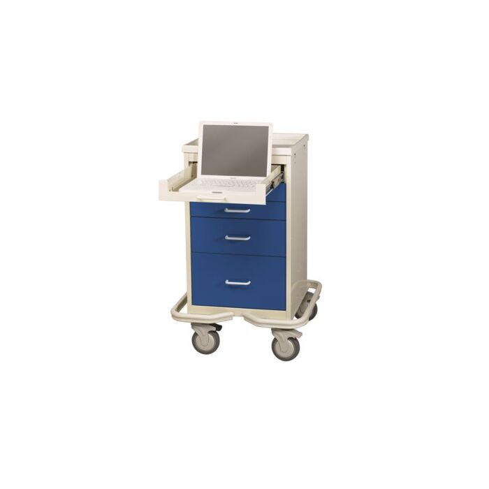 5-Drawer Mini-Tower Computer Cart Increased concerns on medication traceability and use enhances patient safety and makes a laptop a powerful tool. 3" top drawer accommodates a laptop. Maximum mobility with 5” all-swivel casters (1 directional, 2 locking). Cart is 24-1/2"W x 37-3/4"H x 24-3/4"D. Full-extension drawers with ball-bearing drawer slides and Outrigger stabilizing frame. Manufactured with 12 gauge steel and Durable powder-coat paint in two-tone Blue/White. Unit weights 127 lbs and is offered with a 5-year warranty.