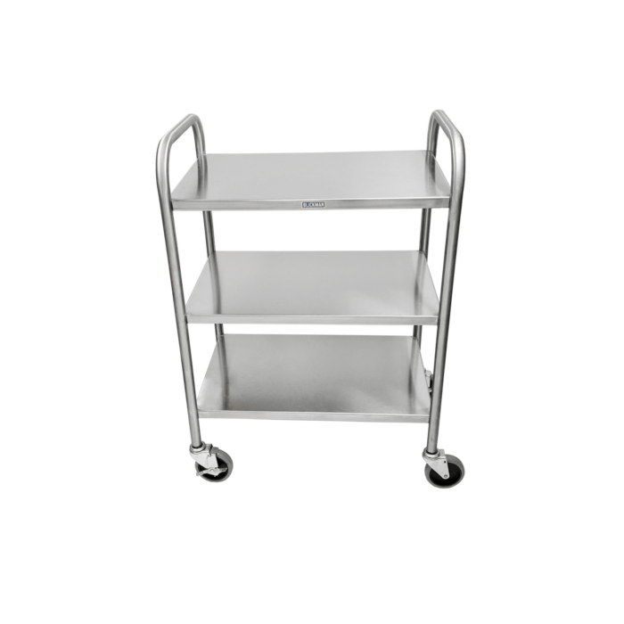 Our medium-duty utility cart with end rails comes standard with three open, solid stainless steel shelves and travels on 4” swivel casters. Optional IV pole attachment is available.