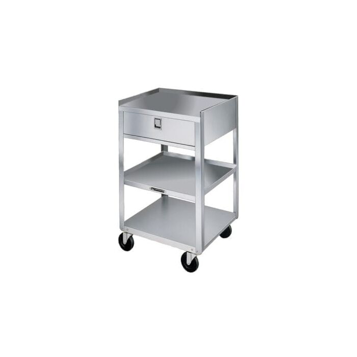 This compact and versatile equipment stand allows for added work or storage space. Shelves are 16 3/4″ x 18 3/4″ making this the most compact cart Lakeside offers. Shelf clearance is 8.125”. Drawer included under top shelf measures 15 1/2″ wide x 18″ deep and 4 1/2″ tall. All swivel 3.5” casters. Overall size 16.75” x 18.75” x 30 1/8"