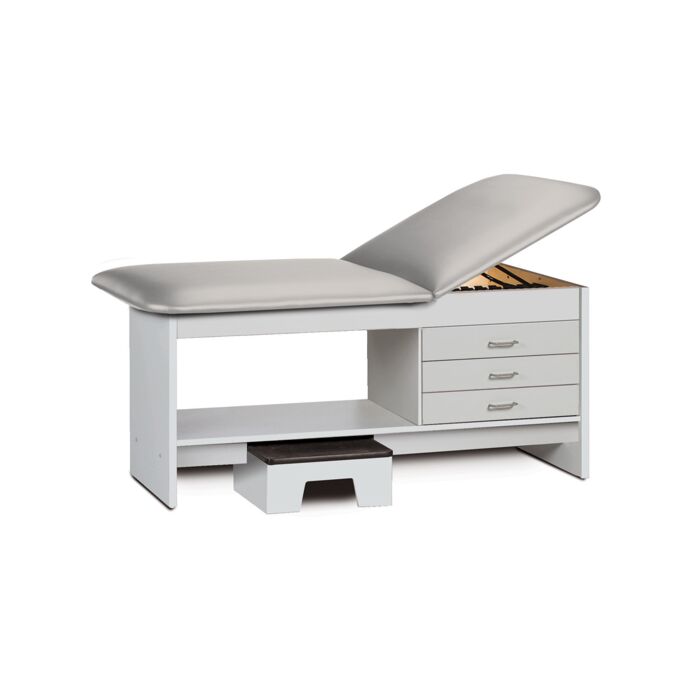 Features 3 drawers, storage shelf, adjustable backrest and matching stool that stores neatly under the shelf