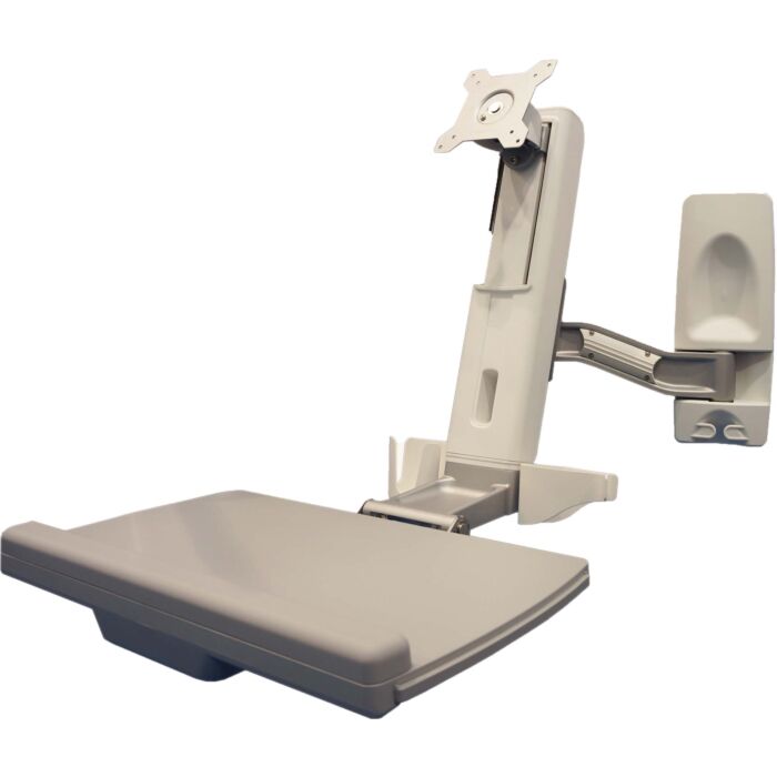 This wall mounted workstation allows a flat panel monitor and its peripherals to be mounted in one apparatus. Our revolutionary hinge modules are designed to enable display monitors to be rotated, swiveled and tilted. The keyboard tray can be flipped and extended to conserve space. The workstation supports monitors up to 17.6 lbs and less or equal to 24”. The workstation features an inside wall track cable management system to connect to the CPU.