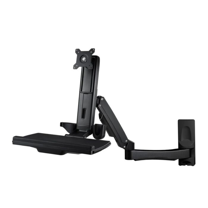 This wall mount workstation system provides a simple way to mount your keyboard, mouse and monitor all onto one flexible extension arm. This give you the ability to easily move your workstation into position where you need it and in the position it is needed. In addition to the ability to move up and down as well as side to side, the screen can be raised, lowered as well as rotated and tilted. When additional space is required, this sit stand workstation wall mount can be made compact by folding the keyboard tray providing the room needed for other important task. Holds monitors 24” – 32” up to 25 lbs. Height adjustable range from 4.88” to 17.27” tall. Available in silver and Black.