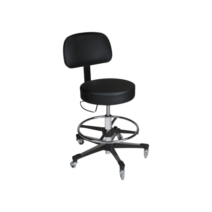 Our deluxe hand-operated exam stools come standard with a foot ring for leg-joint comfort. These stools rest on a 24”-diameter black composite or aluminum base, which comes with Wall Saver™ tips to protect against scuff marks and offer a textured surface for foot grip. Sit in comfort on a 15”-diameter, vinyl upholstered seat with 3” thick polyfoam padding. Travels easily on 2”, single-wheel, hard rubber casters.