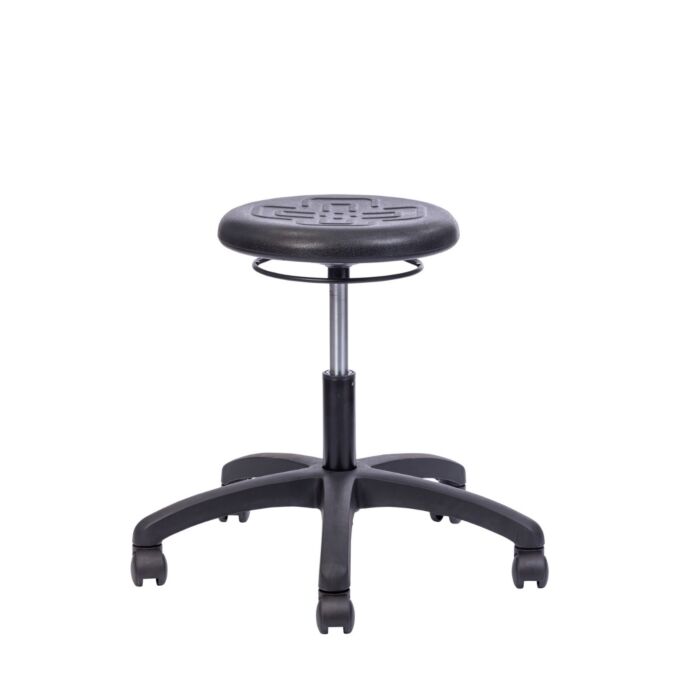 This new heavy-duty polyurethane seating is crafted specifically for durability and comfort. Comfortable and durable 14″ diameter polyurethane seat. Self-skinned, solid molded polyurethane resists stain and damage. Pneumatic seat height adjustment, three heights available – 5”, 8” and 10” travel. 18″ foot ring available on higher stool models. Available with black ABS or polished cast aluminum five star base. Glides or casters available. 275 lb weight capacity. Made in the USA.