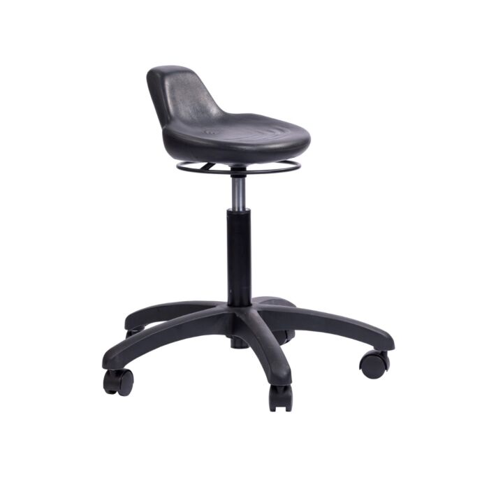 This comfortable and ergonomic Stand Stool is designed to promote a balanced posture. Stool supports the areas that experience the most discomfort as a result of excessive standing. Comfortable and durable 13″ soft black polyurethane seat. Pneumatic seat height adjustment, three heights available – 5”, 8” and 10” travel. 24″ diameter, stable five star base, available in black ABS plastic or polished cast aluminum. 18″ adjustable foot ring available on higher stool models. Heavy-duty stationary glides. 275 lb weight capacity. Made in the USA.