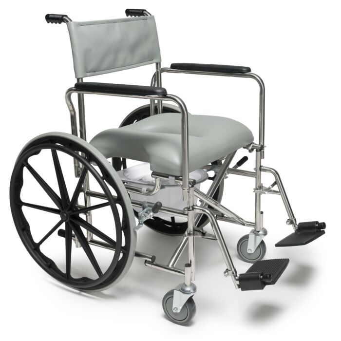 The versatile E&J Folding Rehab Shower Commode chair has earned the reputation of being the premier self-propelled chair for personal hygiene care. This chair features an overall narrow width and a corrosion-resistant stainless steel frame. The chair can be positioned over a standard toilet or used as a portable, self-contained commode.