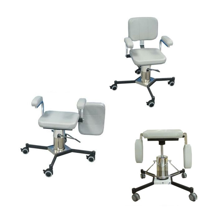 The Imaging Chair is fully adjustable. With the back support and armrests in place, it is a chair, which can swivel 360º. Once wheeled to the proper location, the chair can be anchored while the patient is seated by engaging the foot-operated wheel locks on the four casters. The height of the chair can be increased from 41" to 48" by stepping on the foot pump arm. Hold the arm down and the chair slowly lowers to its minimum height. If you raise the foot pump arm, it locks into that position, which restricts the swivel action of the chair. At the rear of the seat cushion is a locking handle which allows you to move the seat of the chair 4" to the left or right, while the base remains anchored. For lateral and posterior access, the back support and armrests drop out of the way with a simple tug of the corresponding pull pin.