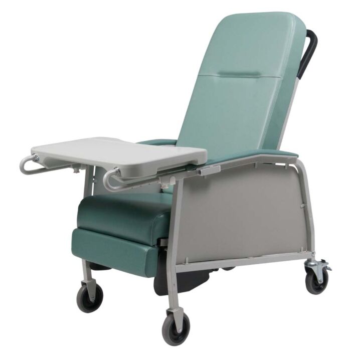 • For safer, easier transport, the Lumex® Three Position Recliner features two, 5" Rear Swivel Casters with Wheel and Swivel locks and 5" fixed front wheels.