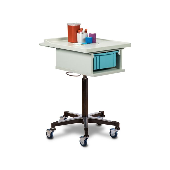 Gray laminate cabinet construction Easy-clean, vacuum-formed, gray, ABS, plastic top with textured finish and raised rim on all sides Removable plastic storage bin on easy slide track 16-1/2" L x 10-3/4" W x 5" D (42cm L x 27cm W x 13cm D) Easy grip, ClintonClean™ solid plastic handle Pneumatic height adjustment Stable, 5-leg, aluminum base Smooth rolling, 3" ball bearing casters (7.62 cm) Optional glove box holder available. Add product GW-2000 Single White Steel Glove Box Holder