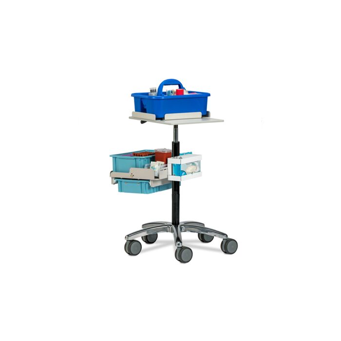 Easy-clean, moulded plastic, rimmed top with convenient plastic storage drawer Easy-grip, ClintonClean™ solid plastic handle Two, mid-height storage compartments featuring: one, storage tray with two, plastic, storage bins, a large, tray section with a large, plastic bin and a lockable* storage bin Large, stable, 5-leg, chrome base Pneumatic, height adjustable cylinder White, powder-coated steel, glove box holder Universal attachment rail 4" dual-wheel, hooded casters Fast, easy assembly with basic tools