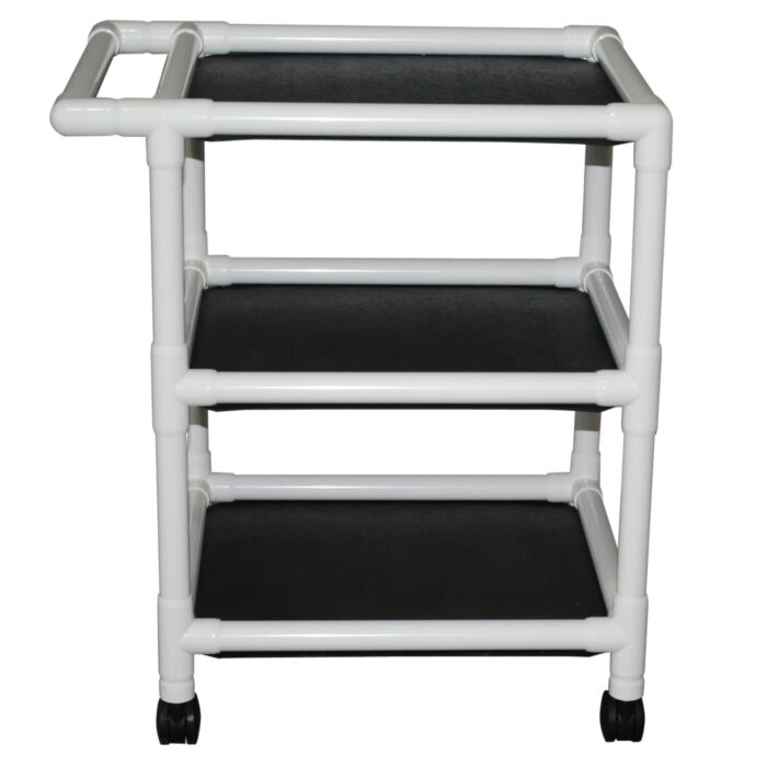 Multipurpose PVC cart on casters. Features Shelf Size: 24" x 25" 31.5"L x 37"H x 24"W Height between shelves: 14.5" Carrying capacity Per Shelf: 75 lbs.