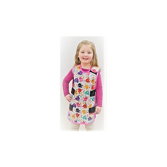 Features front and back protection with two adjustable hook and loop closures, one at the upper waist and one at the lower hip.  Also has an adjustable shoulder for ease of putting apron on and adjusting around breast / shoulder area.  Because of the versatility in fit, it accommodates a wide range of wearers.  Shoulder pads included.
