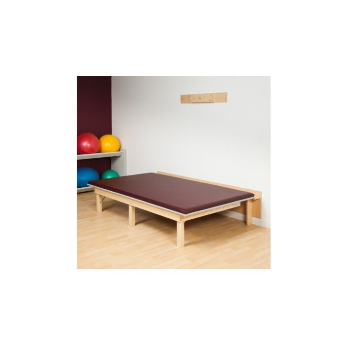 Heavy duty, upholstered mat platform in Natural wood tone with Solid hardwood legs and plywood frame. Features full back wall that is floor supported. Frame is attached with steel angles and has a 3 front-leg design. Folding legs with lock in place latch and 500 lbs. load capacity under normal use. Gray edge bumper guard to protect the top from tears. 2" ultra-firm, foam padding. Mounting hardware is not included. Check with your building manager for the proper type of fasteners needed for your specific wall structure.