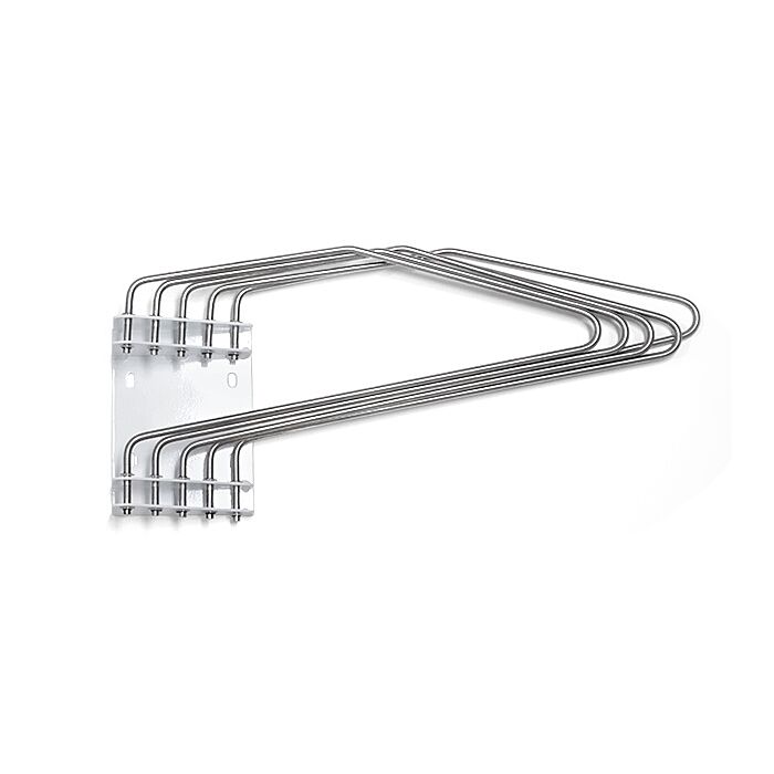 The Wall Rack offers great storage capacity. The heavy duty metal rack holds up to 5 aprons on 5 arms to a maximum suggested weight of 110 lbs. It features five chromium plated pivoting hangers which can flatten out nearly 180 degrees. It’s great for storage behind doors, equipment, etc…