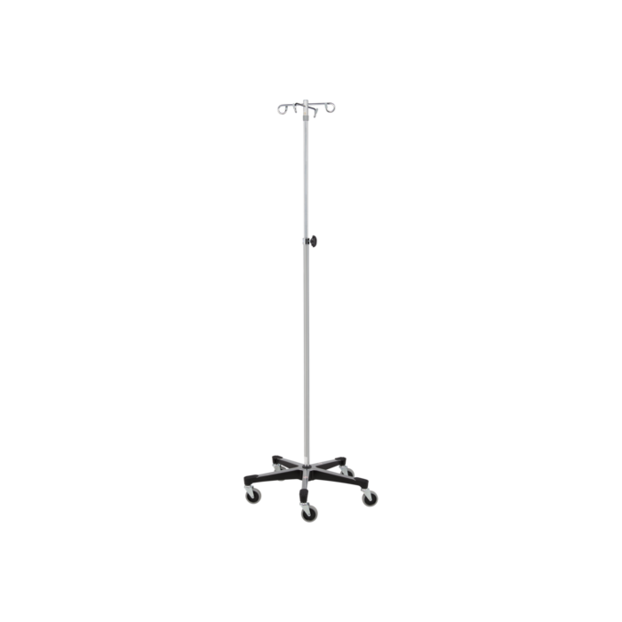 FIVE-LEG IV STANDS sit on a 24"-diameter, polished, die-cast, aluminum base with Wall Saver end-caps to protect against scuffmarks. All chrome stands feature colored, poly-coated, secure-grip hook-tips for protection and identification. Five-leg IV stands travel on 2-1/2", twin-wheel, hooded casters or 2"-or-3", hard-rubber, swivel casters. Special features can be found on MODEL 1350, our heavy-duty chrome IV stand with a 1-1/4"-outside-diameter base post and 1"-outside-diameter extension post.