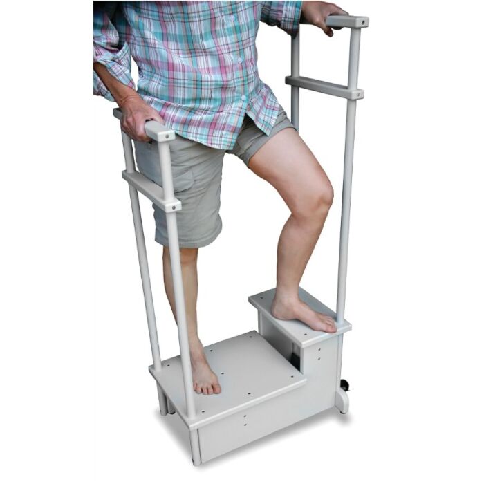 - Easily portable with built-in rollers and grab bars, these steps can be moved from room to room or be parked out of the way when not in use