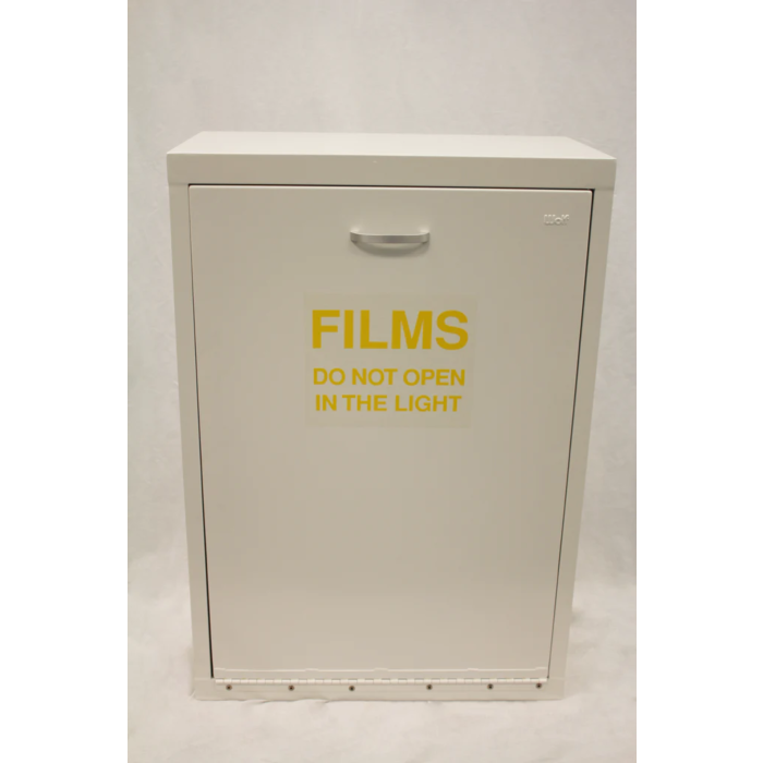 This light-proof cabinet is designed for film storage of sizes 5" X 7" to 14" X 17". It’s hinged at the bottom, providing easy access without bending over. The non-moveable dividers provide an easy filing system. Bin height is ideal for placement under a countertop. An optional switch is available for automatic room light cut-off when the door is opened. Holds 4 boxes (400 pieces) of film.