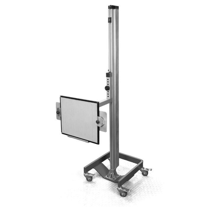 It accommodates a wide range of sizes, from 8″x10″ to 17″x17″ cassettes, including DR Panel Protectors and Grid Encasements. The height adjustment range spans from 6″ to 46.5″ from the floor (measured at the bottom edge of the cassette), ensuring both mobility and stability in any environment. The cassette holder arm extends 19.5 inches from the pole, the base measures 19 inches wide by 22 inches deep, and the pole stands at 70 inches tall with a total height of 75 inches, including the 5-inch tall casters.