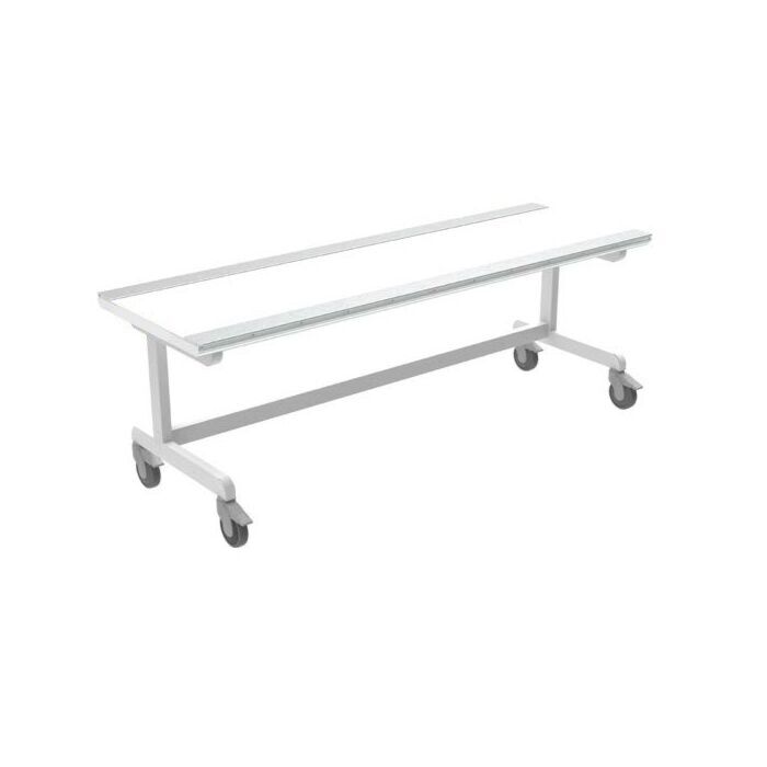 It features a heavy-duty steel frame for maximum stability and a stain-resistant fiber-resin tabletop. Its large-diameter casters provide smooth movement, swivel 360°, and have easy, yet reliable, foot locks.