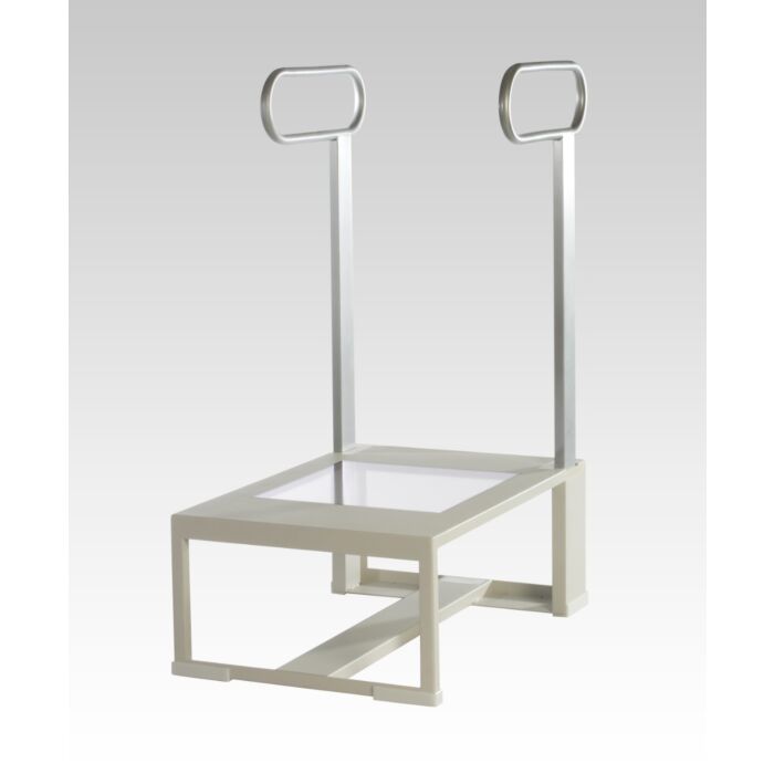 The U-Arm Footstool features handrails for stability, a single-step platform with a clear top for easy positioning, and allows for standing feet x-rays without applying any patient weight to the imaging receptor. This stand is equipped with plastic slides on one set of legs and a friction material on the other set of legs. This eliminates the need for wheels. The user simply leans the hand rails back toward them and slides the stand. Stand has an aluminum frame and is lightweight.