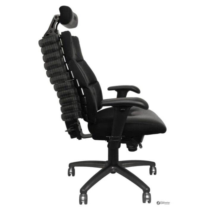 • Patented spine-adaptive back design • 11 torsion spring-loaded joints form to your spine • Locks in custom posture at the touch of a lever • Executive model includes headrest • Black base and Black ribs • Dual-density seat foam for lasting comfort • Multi-function 05 control with seat slider • Supports users up to 300 lbs • Premium black leather upholstery standard