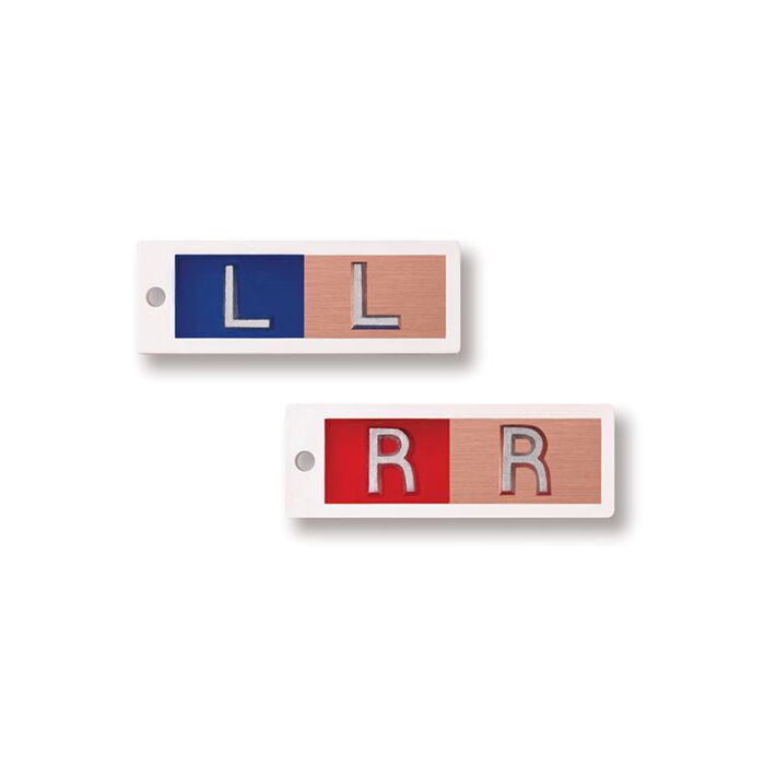 These markers contain a copper filter in one half of a double marker set. This allows the technician to mark the films at varying x-ray exposures or subject densities without changing the markers.