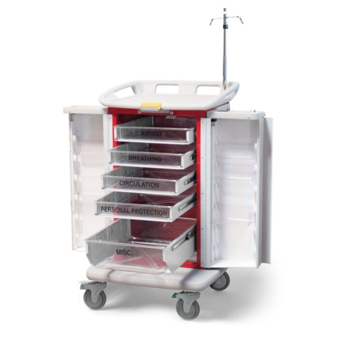The ER2000 emergency cart is unlike any other emergency cart on the market. Simple and easy to use, press the bright yellow “open” button located at the top center. The doors spring open and can lock into place allowing full access to the contents needed in any emergency situation.