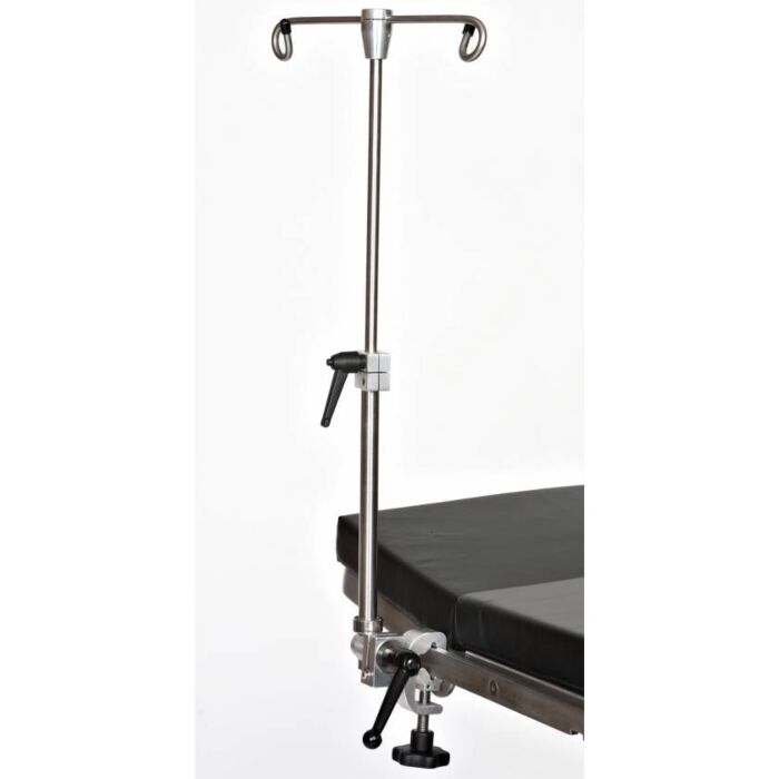The main clamp of the Uni-Pole universal clamping IV Pole is what clamps the IV Pole to the table leg, bed rail or operating table side rail. The second handle adjusts the positioning of the universal IV Pole. The IV pole will adjust 360 degrees in pretty much any position you desire. The third handle, part way up the pole, adjusts the height. The pole adjusts from 18″ to 36″ in height.