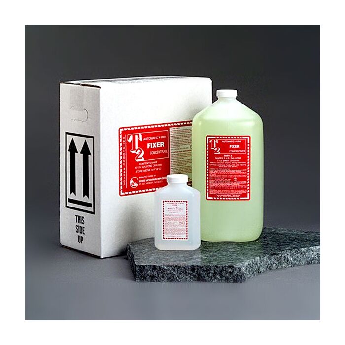 T2 Fixer is a premium quality rapid fixer which provides superior clearing and drying with all x-ray films. It contains a prprietary surfactant which acts as a chemical blanket to greatly decrease fumes by reducing vapor pressure without compromising drying capacity or sulfite level. T2 Fixer is a clean working formula compatible with in-line electrolytic silver recovery units. Reduces maintenance costs due to fixer build-up. Compatible with all radiographic and cine films and all x-ray developers.
