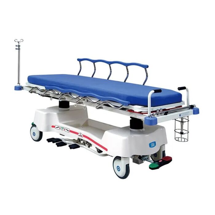 Features Chest X-ray compatible platform Stainless steel collapsible siderails with safety lock Wave shaped siderail is easy to grasp Set stretcher in upright seated position, flat, Trendelenburg, and reverse Trendeleburg Foot pedals on both sides for hydraulic height and Trendelenburg adjustments from any position Gas-spring assisted backrest adjustment (0-90 degrees) Two-step footrest lever (up to 15 degrees) Crank mechanism for knee flexion adjustment at the foot end Central braking and steering system 5-inch central brake casters with dust-proof covers ABS bottom cover with integrated storage bin Four ABS corner bumpers Six drainage bag hooks Ten restraint strap holders Two-step adjustable stainless I.V. pole Driving handle can be located at either end and stored while not in use Retractable fifth-wheel steering  0.5m3 Oxygen Tank Holder, located at the head section, can rotate in/out, according to medical requirement Technical Specs