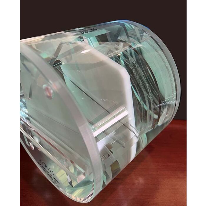The ACR MRI Phantom is an 8" (203.2 mm) diameter cylinder, 6.82" (173.40 mm) tall with various fixtures inside, including a grid, cylinders, and other points of interest. Marked with reference points for nose and chin. The Phantom is approved by the American College of Radiology and is compatible with the ACR Phantom Cradles.