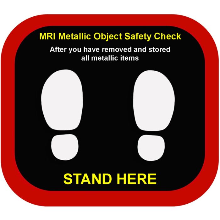 The MRI Final Safety Screen Floor Plaque Sticker (15"tall x 17”wide) is designed to enhance MRI safety, guide patient positioning, and support compliance with facility screening protocols. This highly visible floor marker clearly indicates where patients should stand before entering the MRI environment, helping technologists maintain consistent screening procedures and avoid confusion during busy workflows. Manufactured from non-magnetic materials and featuring an anti-slip surface, it delivers the safety and reliability required in MRI Zones 2 and 3 while remaining fully functional in heavy-traffic clinical environments.
