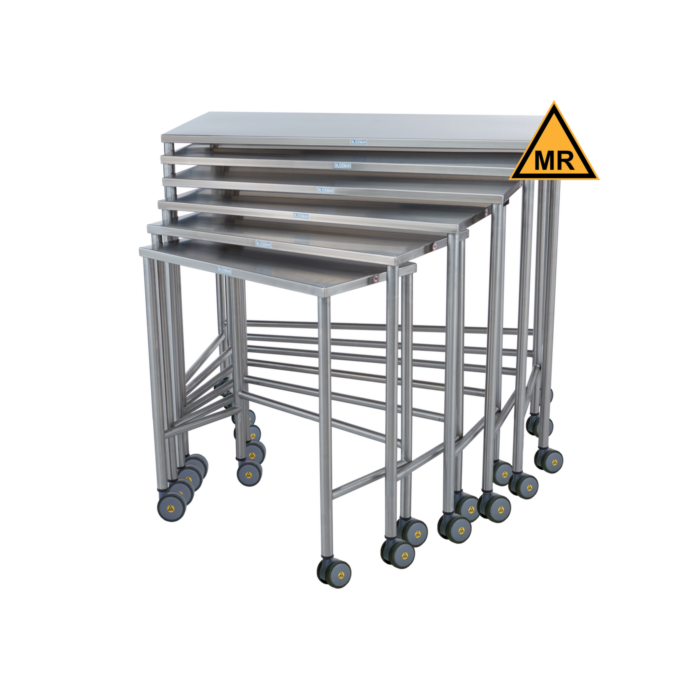 These six nested MR conditional instrument tables are space-saving alternatives with a unique design that requires only 8 square feet of floor space while yielding 31 square feet of usable workspace.  All tables travel on 2” MR casters.