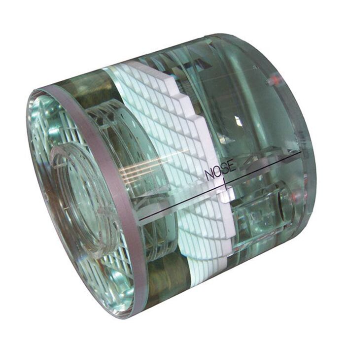 The ACR MRI Phantom is an 4.5" diameter cylinder, with various fixtures inside, including a grid, cylinders, and other points of interest. Marked with reference points for nose and chin. The Phantom is approved by the American College of Radiology and is compatible with the ACR Phantom Cradles.