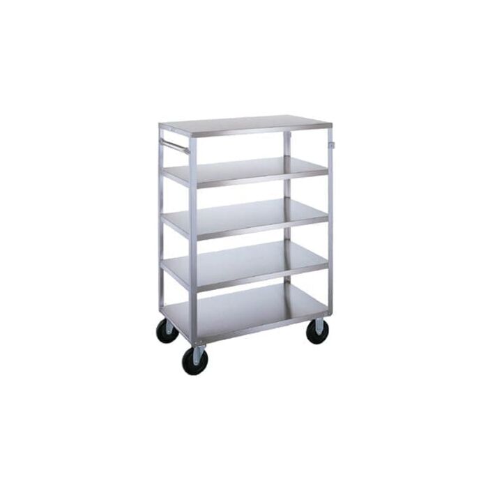 Ideal for continuous transporting over various standard floor surfaces, transporting many items at one time, and creating more useful space in a prep area. Provides mobile storage where you need it. Stainless steel construction combined with electronically welded seams for extra durability. Handle and front leg bumpers to protect walls and furniture. All shelf edges down allows for easy loading and unloading from all sides. Shelf size is 18” x 31” with 9.375 shelf clearance.  5” casters, 2 swivel and 2 are fixed. 5 shelves. Cleans and sanitizes easily, simply wipe down or steam clean. Overall size is 19 1/8” x 35 x 45 1/8”