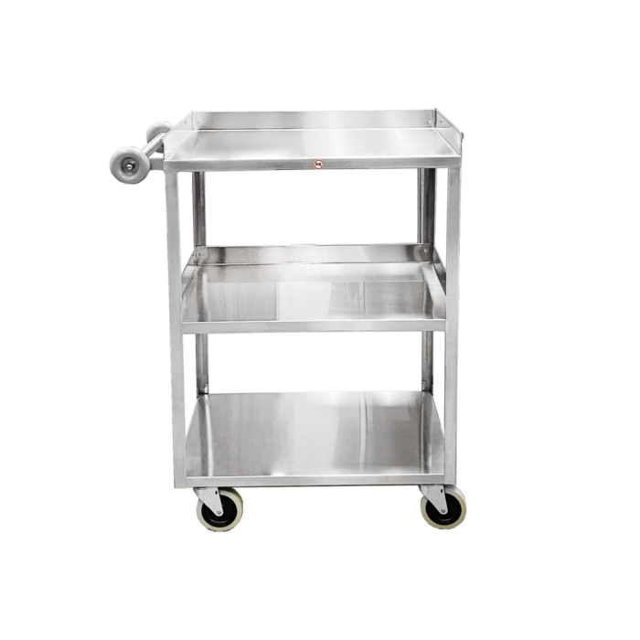 Our light duty cart models include three solid stainless steel shelves with one push handle that has protective rubber bumpers on each corner, and travels on four 4” swivel casters. The top and middle shelves have three edges with 1-1/4” sides and a front open edge to slide equipment in and out with ease. The bottom shelf has four open edges for greater accessibility to equipment stored in a lower position. You can also choose to add additional guardrails or an IV pole attachment.