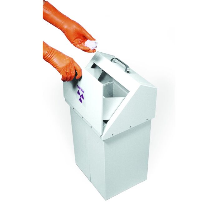 Used in facilities that generate low-energy beta and gamma radiation waste. This Shielded Waste Container's interior is constructed of .063″ aluminum and .25″ lead. The shielding combination attenuates gamma radiation, beta radiation and errant bremsstrahlung. Extra protection is provided with a specially designed hatch door that protects the user from container contents even while open. Convenient side handles let you easily lift the container top to empty decayed contents. Sleek and sturdy, the exterior is constructed of steel, with a powder-coat finish.